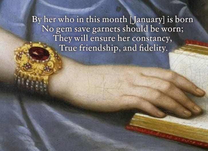Metaphysically, garnets have long been associated with creativity, love, and devotion. From an 1870 Tiffany & Co pamphlet on birthstones: